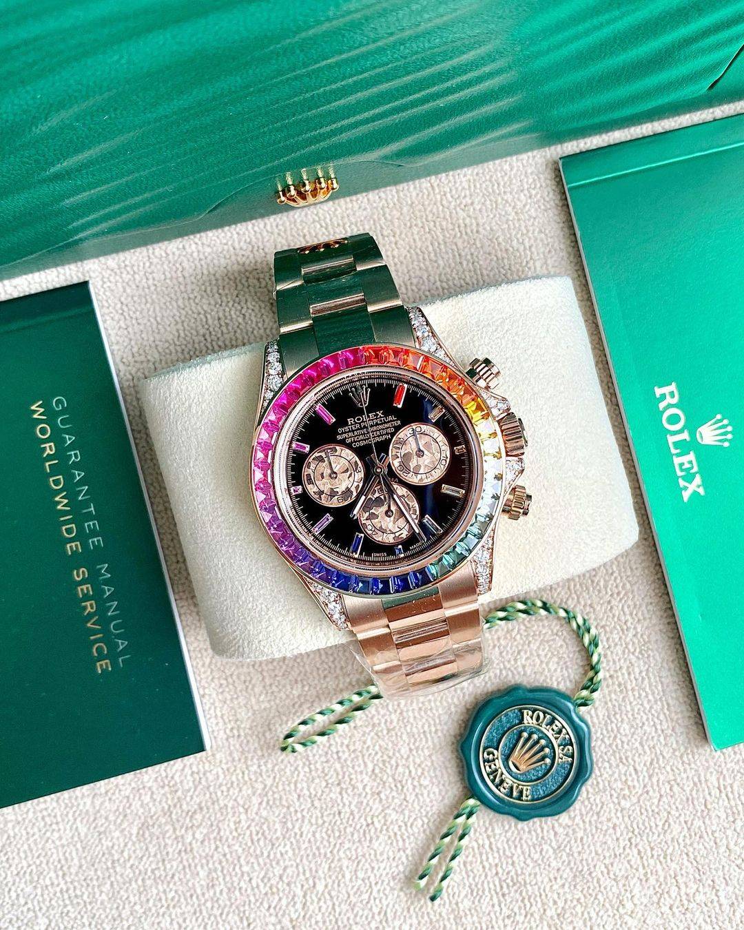 The Rolex Daytona Rainbow (116595RBOW) comes in three versions- the original 2012 Yellow gold and White Gold vintages and the new brand new Everose. A thoroughbred Rolex Daytona
