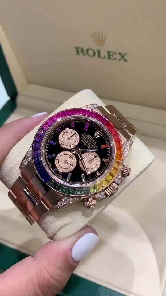 The Rolex Daytona Rainbow (116595RBOW) comes in three versions- the original 2012 Yellow gold and White Gold vintages and the new brand new Everose. A thoroughbred Rolex Daytona