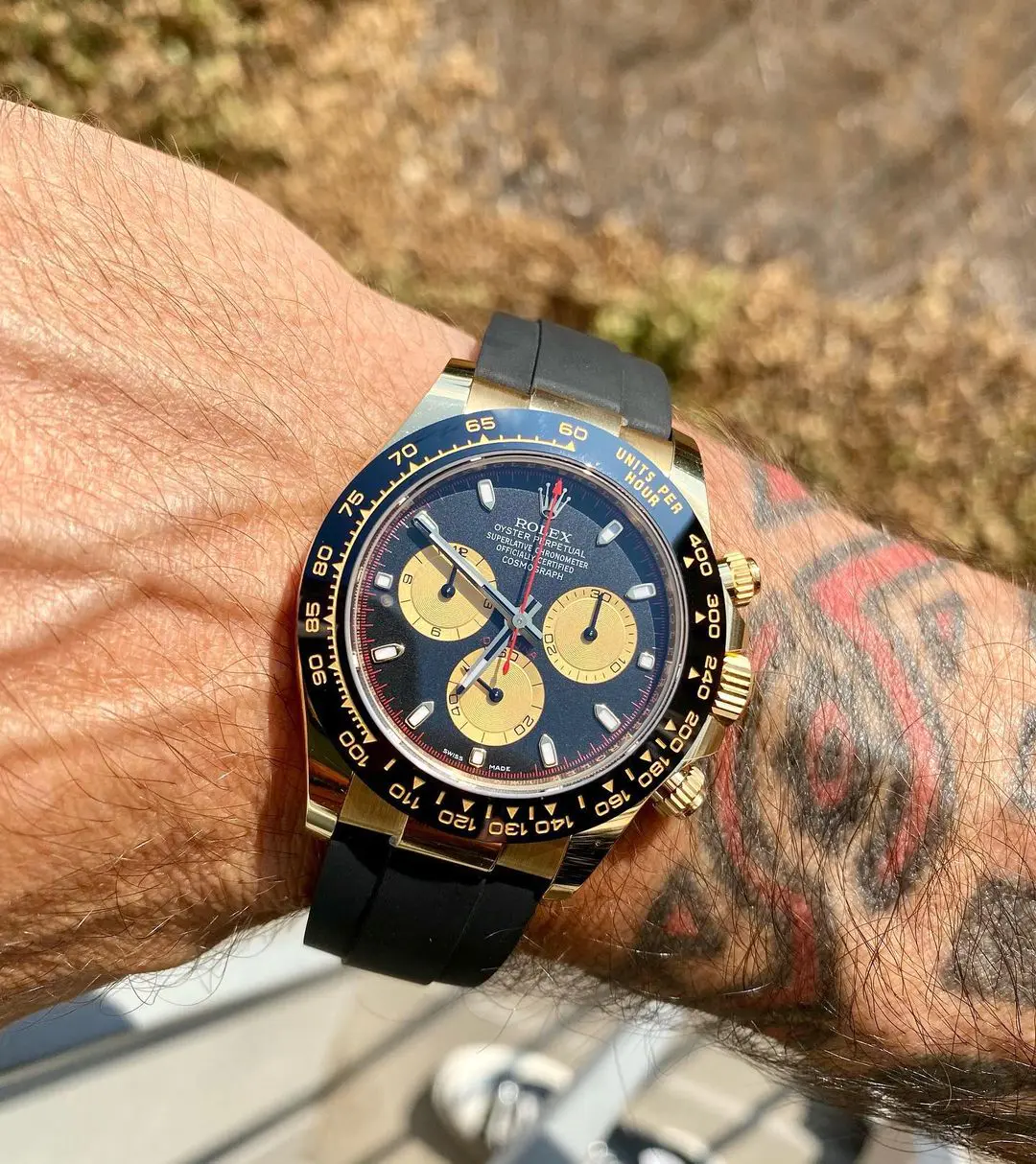Although this one can be worn casually, the everose paired with the olive green is so luxurious looking, you’re going to want to show it off when your dressed in your best.