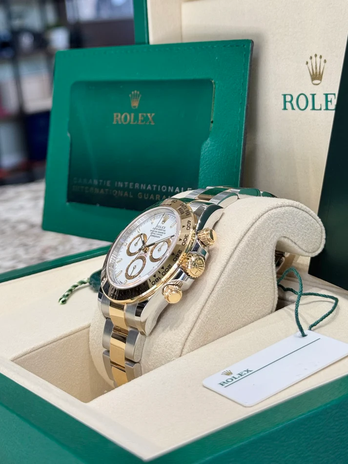 Rolex Daytona Cosmograph (116503) self - winding automatic watch, features a 40mm stainless steel case with an 18k yellow gold bezel surrounding a white dial on a stainless steel and 18k yellow gold Oyster bracelet with folding buckle.
