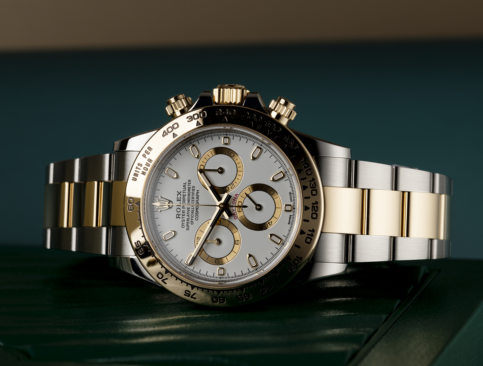 With its tachymetric scale, its three counters and its pushers, the Cosmograph Daytona was designed to be the ultimate timing tool for endurance racing drivers. The bezel features a tachymetric scale to read average speed over a given distance based on elapsed time. This scale offers optimal legibility, making the Cosmograph Daytona the ideal instrument for measuring speeds up to 400 units per hour, expressed in kilometres or miles.