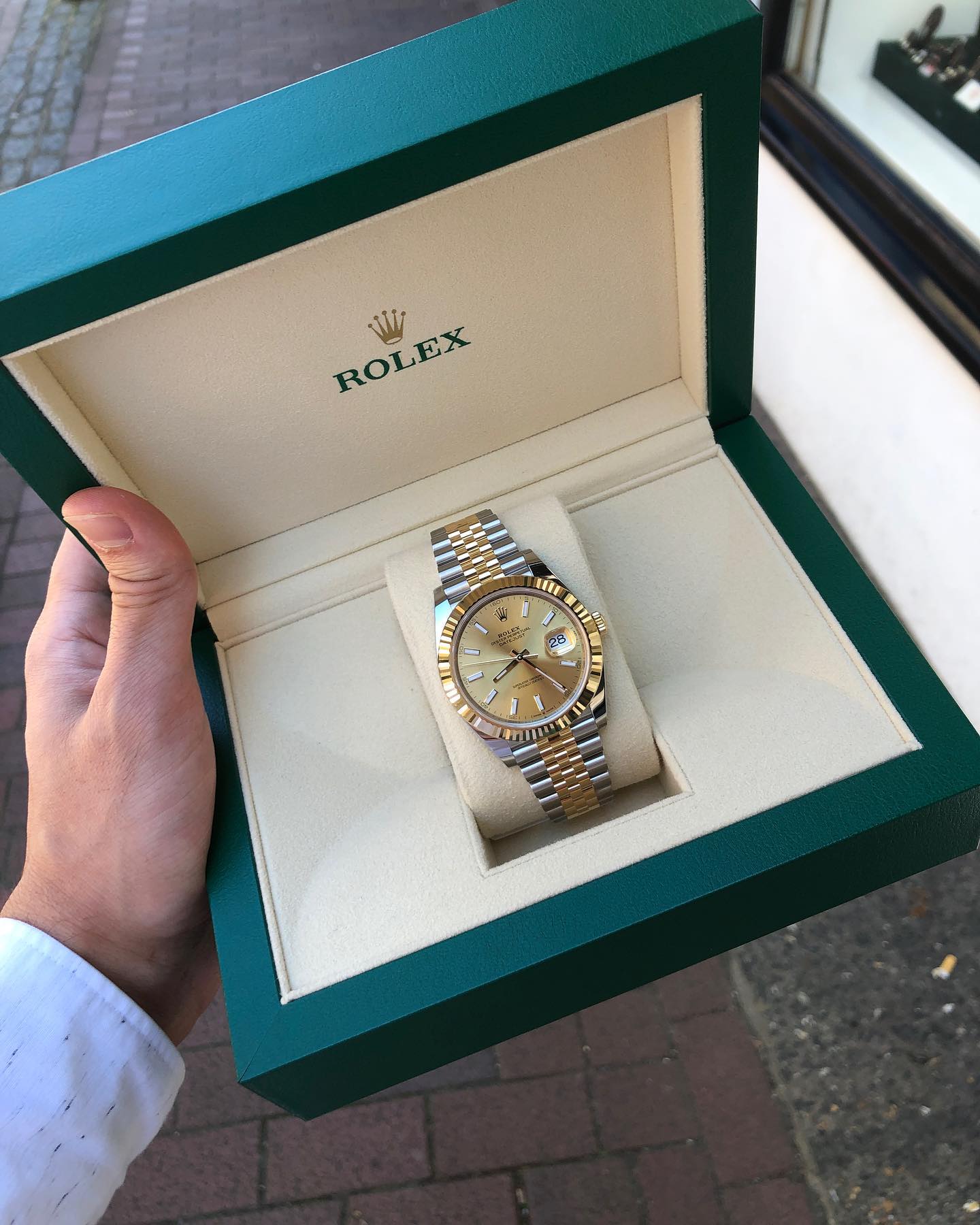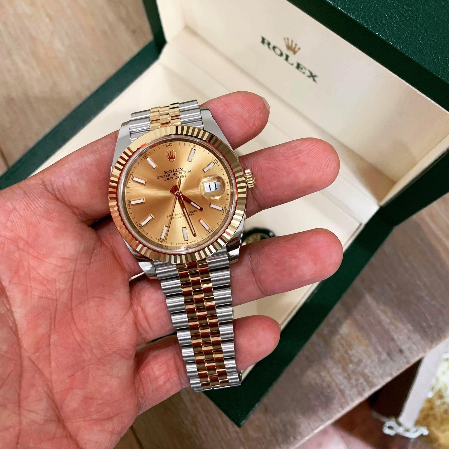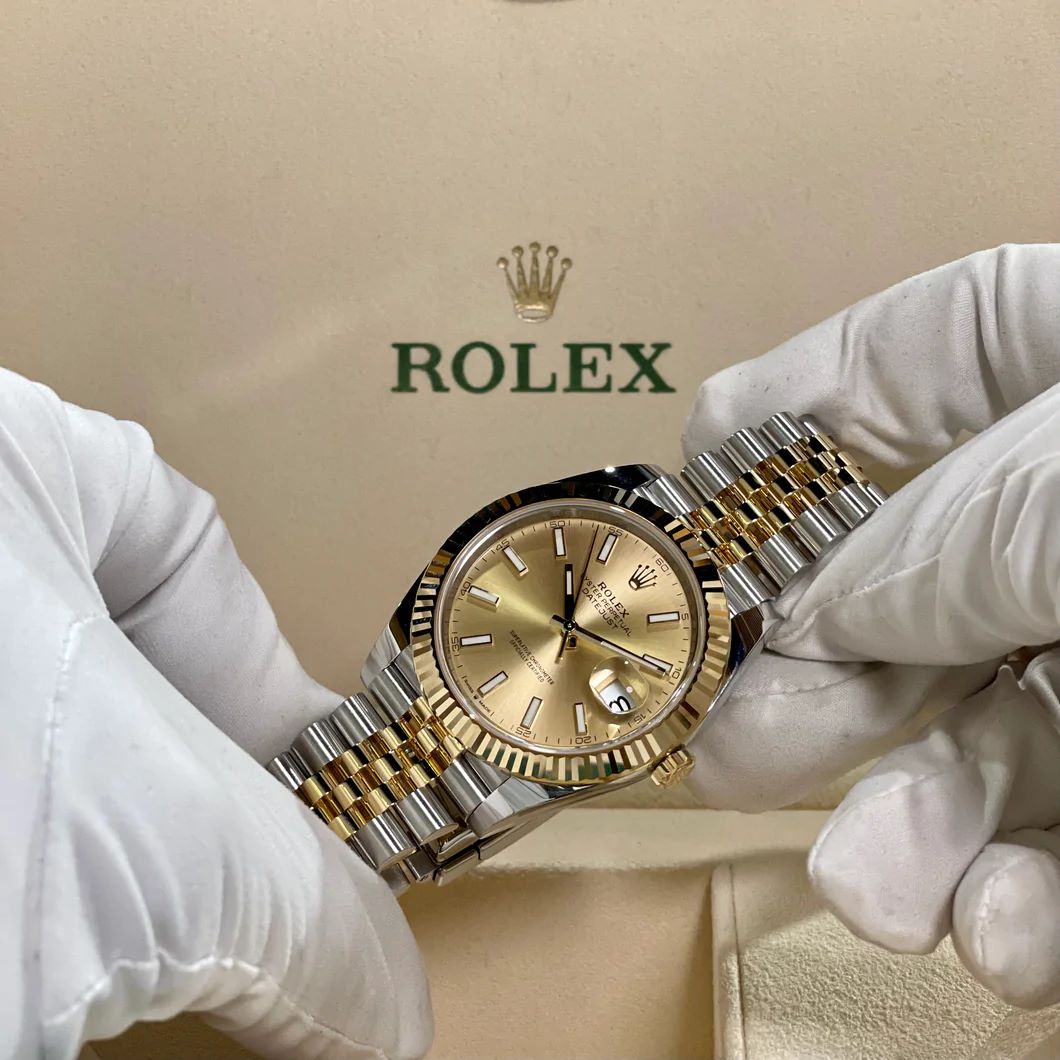 41mm Yellow Rolesor case with 904L steel monobloc middle case, screw-down steel back, 18K yellow gold screw-down crown, 18K yellow gold fluted bezel, scratch-resistant double anti-reflective sapphire crystal with cyclops lens over the date, champagne dial, index hour markers, Rolex caliber 3235 perpetual self-winding movement with date at 3 o'clock that changes instantaneously at midnight in a few thousandths of a second, approximately 70 hours of power reserve, yellow Rolesor Jubilee bracelet made from a combination of 904L steel and 18K yellow gold with five-piece links, folding Oysterclasp buckle with Easylink 5mm comfort extension link. Waterproof to 100 meters.
