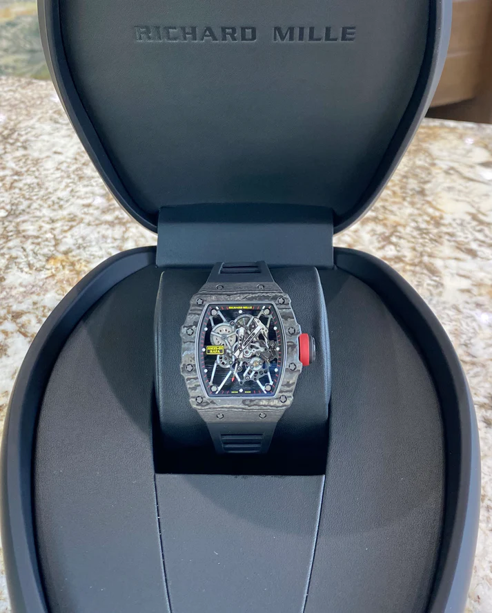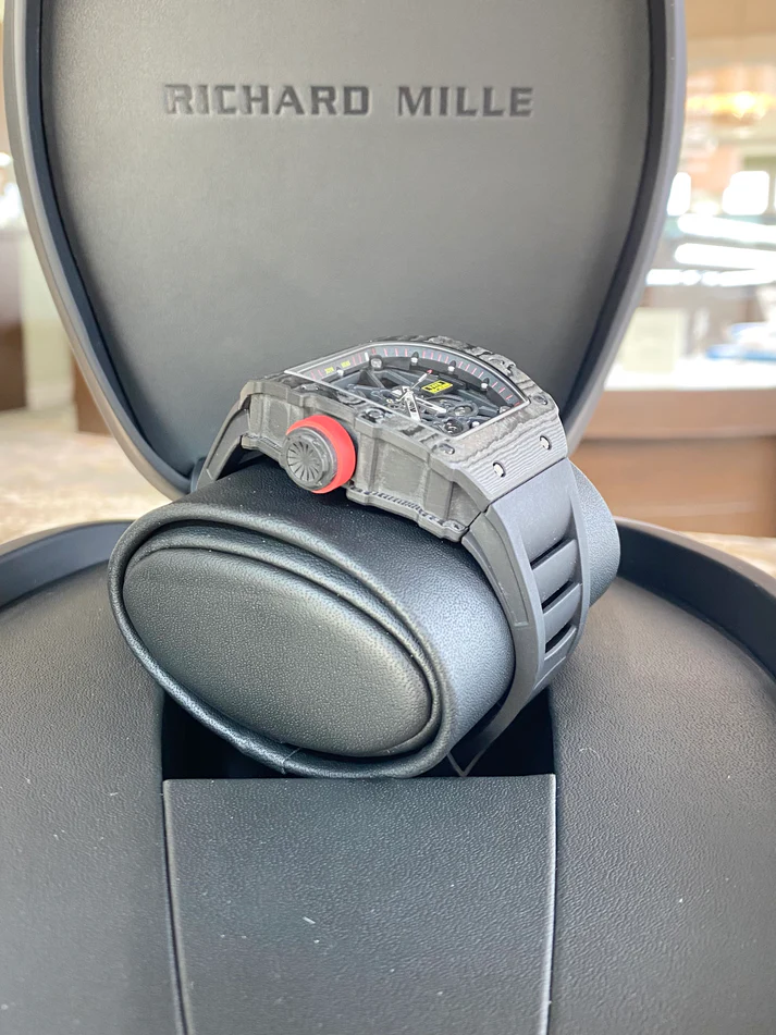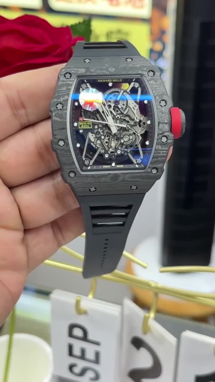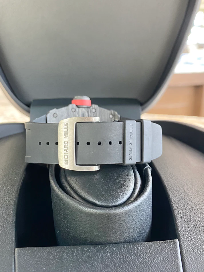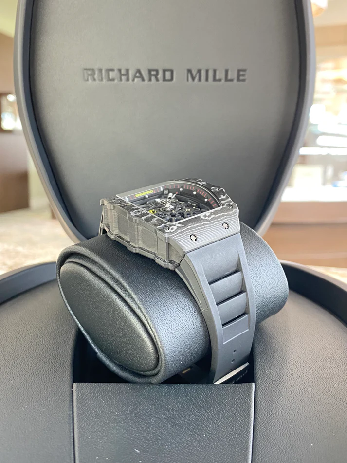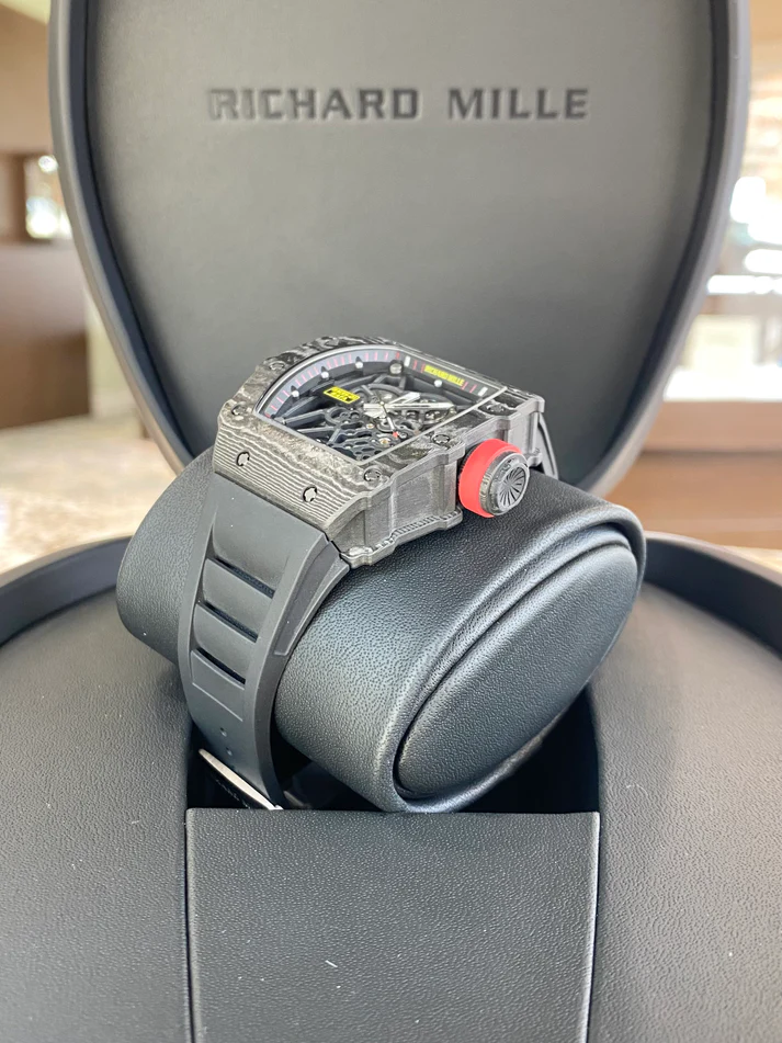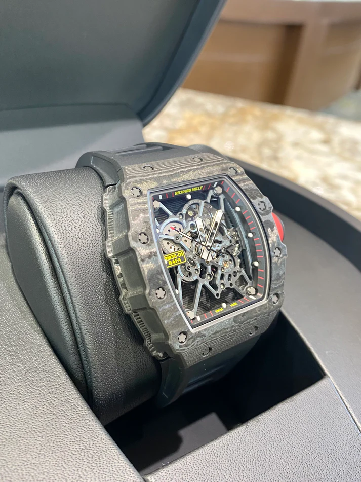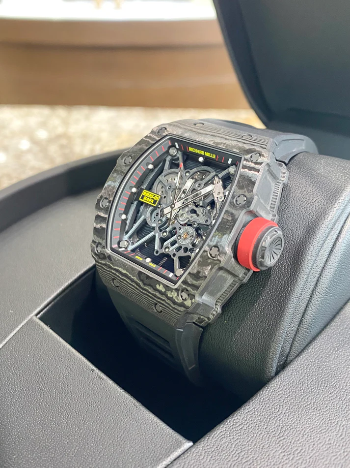 he Richard Mille RM35-02 Automatic Skeleton Dial Replica is a luxurious watch with a sleek design. It features a carbon case and black bezel, both made of carbon, and a sapphire crystal for added protection. The movement is an automatic caliber RMAL1 with a power reserve of 60 hours and a precision of (-3/+3 sec/day) within COSC certification limits. The dial is transparent with stick indices and stainless steel stick hands. The bracelet is made of rubber and is adjustable for all sizes, with a titanium fold clasp in steel color.