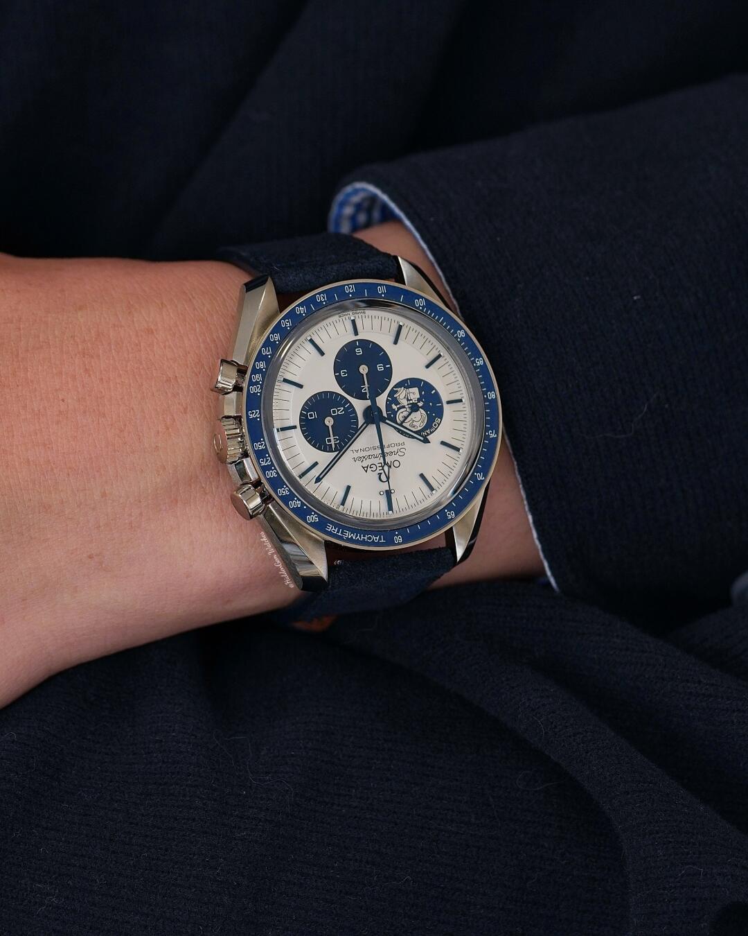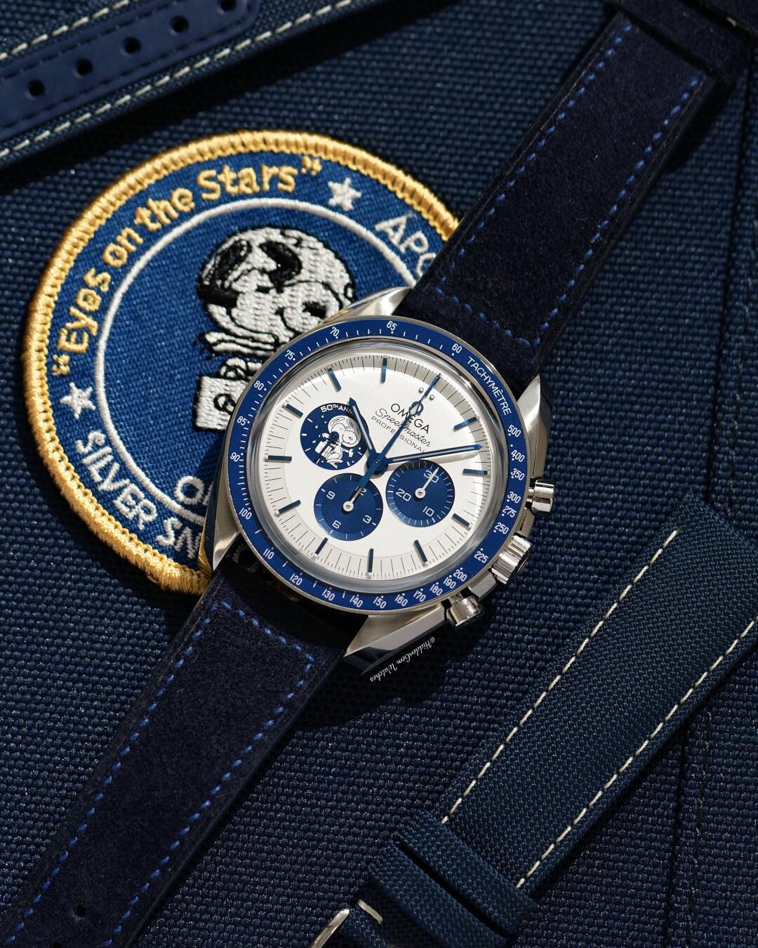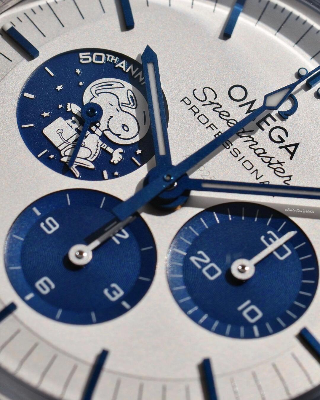 The appearance of the new Speedmaster Snoopy commemorative watch continues the style of the previous generation, including the 42mm stainless steel case and the lower three-eye chronograph dial, etc., but the latest third-generation interpretation of the Snoopy medal pattern is still different from the predecessor; the pattern of the first generation is colorful, while the third generation has a white Snoopy medal pattern engraved on the blue small dial, and the words "50th Anniversary" are added above the pattern. In addition, if you look closely at the 12 o'clock position on the dial near the pointer, Omega has written the words " Ag925 " in an intaglio manner, indicating that the dial is made of silver, which slightly echoes the story of NASA's Silver Snoopy Award.