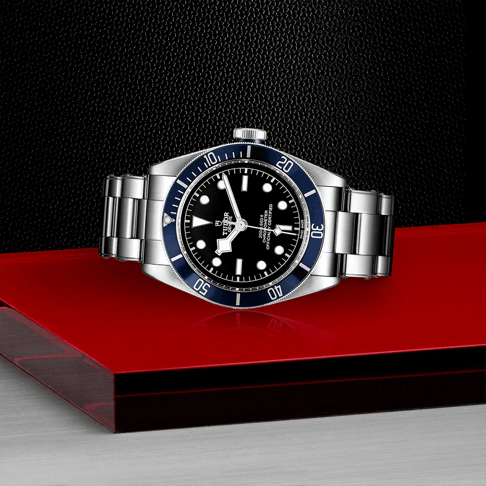 Powered by an in-house chronometer-certified self-winding movement, this rugged and ready Tudor Black Bay watch creates a huge wrist presence, thanks to its confident 41mm stainless steel case. It Features a steel unidirectional rotating bezel topped with a matt blue anodised aluminium disc to show remaining dive minutes. This men’s Tudor Black Bay watch Features retro sporty aesthetics carried through from the company’s original range of 1950’s diving instruments. A domed black dial with grey indexes presents the time legibly alongside a set of chunky luminous coated central hands. The COSC-certified Calibre MT5602 movement will provide the wearer with an impressive 70-hour power reserve for those periods where he wishes to alternate the timepiece with another Tudor favourite. The watch will keep perfect time without missing a beat. This 200-meter water resistant men’s Black Bay watch secures to the wrist with a robust riveted stainless steel bracelet. A highly durable folding clasp promises a close fit against the skin, as well as an innovative safety clasp. The steel screw-down winding crown on this watch is adorned with an engraving of Tudor’s iconic rose motif. Its surface has also been black lacquered and finished with a blue anodised aluminium winding crown tube to match the finish on the diver’s bezel.